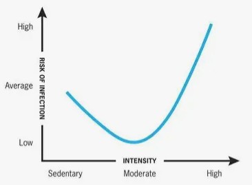Research consistently shows moderate exercise enhances immune function. One epidemiological study meta-analysis of 23 studies with over 3000 participants, found that people engaging in aerobic exercise 5+ days per week had 43% fewer days with upper respiratory infections compared to minimally active individuals (Nieman et al., 2011). A systemic review (Chastin et al., 2021) found no detrimental immune effects from regular physical activity up to moderate-to-vigorous intensity (60-600 minutes per week). While the J-curve relationship shows that prolonged, intense exercise causes immunosuppression and moderate intensity exercise improves immune function. So, a good immune enhancement target is 60 to 600 minutes per week. Keep in mind that overexertion during any single exercise can potentially be detrimental to your body. Prolonged, intense exercise causes immunosuppression (Exercise and Respiratory Tract Viral Infections – PMC) and creates what researchers call an “open window” where your immune system is temporarily weakened for 3-72 hours after intense exercise.