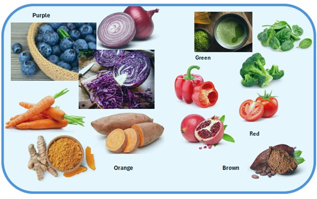 - Purple: blueberries, red cabbage, purple onions